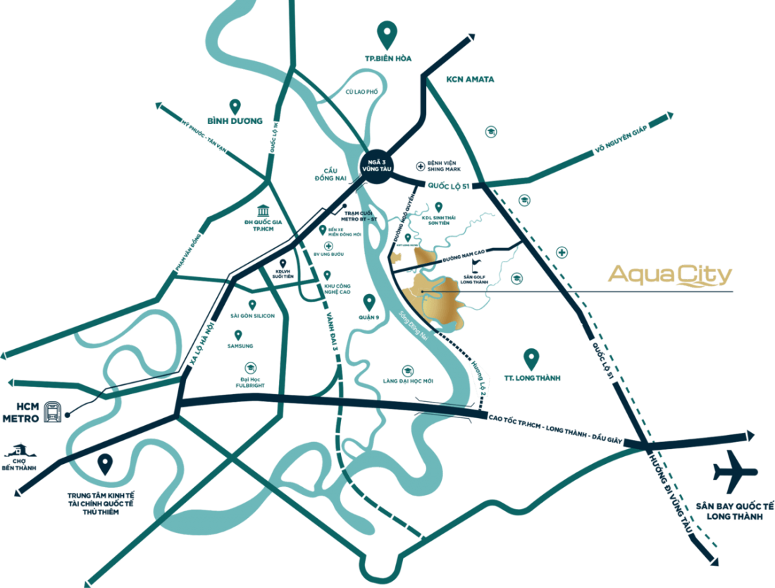 Bên cạnh đó, dự án Aqua City Phoenix Central còn được bao quanh bởi những trục đường giao thông huyết mạch như: Quốc lộ 51, cao tốc Biên Hòa – Vũng Tàu, cao tốc Bến Lức – Long Thành, Vành đai số 4… là cửa ngõ dẫn vào sân bay Quốc tế Long Thành với khoảng cách chỉ 2km, dễ dàng kết nối với khu Đông của Tp.HCM và các tỉnh phía Nam.
